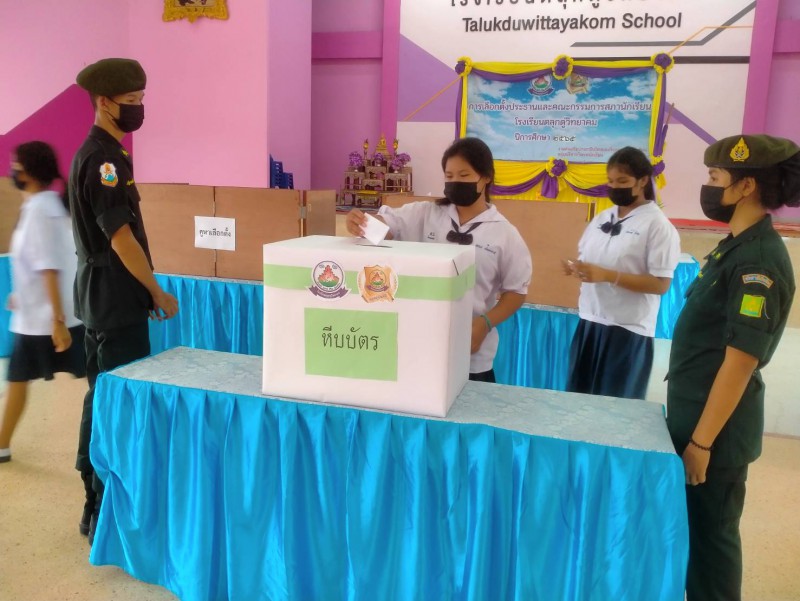 และมอบทุนการศึกษาให้กับนักเรียน เวลา 13.00-15.30 น. ดำเนินการเลือกตั้งคณะกรรมการสภานักเรียน