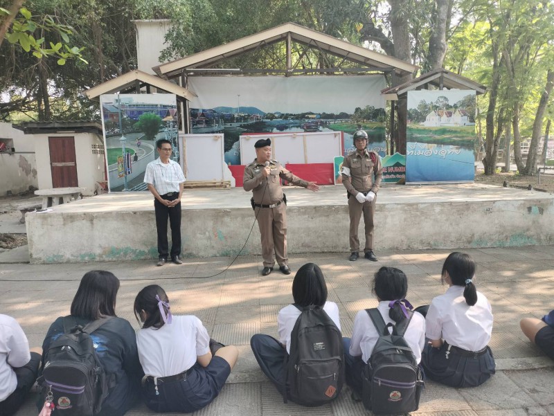 มาอบรมให้ความรู้นักเรียนเกี่ยวกับงานจราจร การขับขี่รถจักรยานยนต์ บริเวณลานศิลป์ร่มธรรม