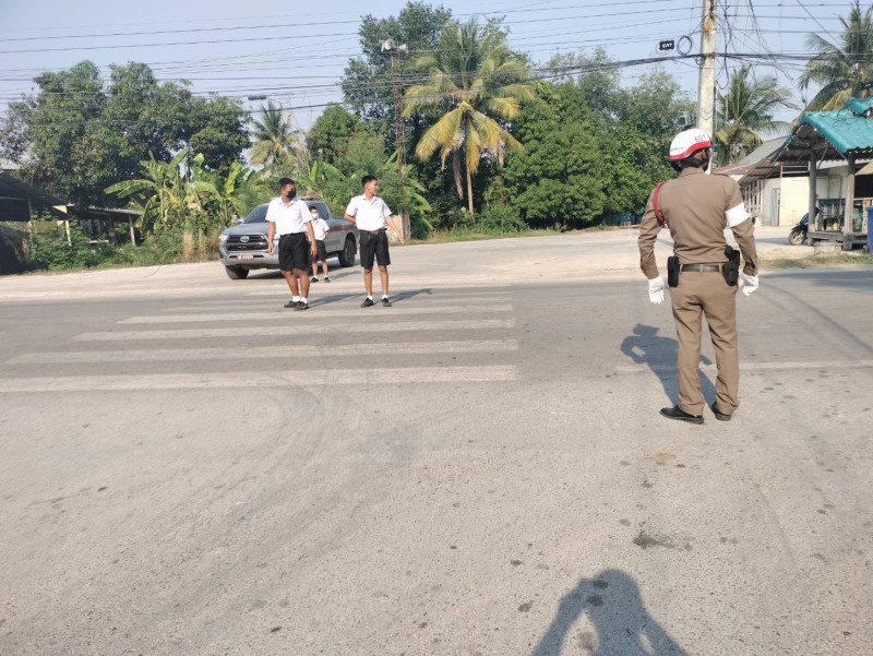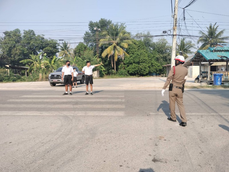และตัวแทนนักเรียนปฏิบัติหน้าที่งานจราจร บริเวณถนนหน้าโรงเรียนตลุกดู่วิทยาคม อำเภอทัพทัน จังหวัดอุทัยธานี