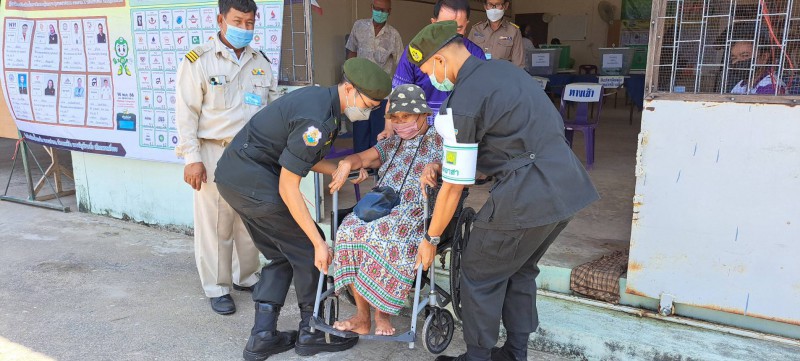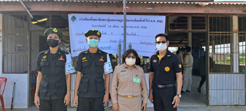 นายละเมียด คำรื่น ผู้กำกับนักศึกษาวิชาทหาร และนักศึกษาวิชาทหาร ร่วมอำนวยความสะดวกผู้มีสิทธิเลือกตั้ง