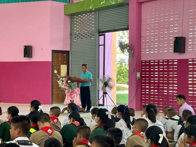 ณ อาคารเอนกประสงค์ (โรงยิม) - ห้องเรียนโรงเรียนตลุกดู่วิทยาคม อำเภอทัพทัน จังหวัดอุทัยธานี
