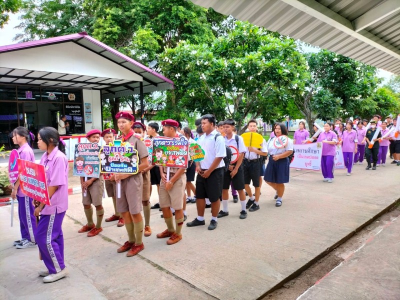 และตัวแทนนักเรียนถือป้ายรณรงค์ เนื่องในวันต่อต้านยาเสพติดโลก รับผิดชอบโดย นายจำรัส อิสภาโร
