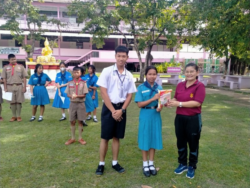 นางสาวนงลักษณ์ อ่ำสุพรรณ หัวหน้ากลุ่มบริหารวิชาการ มอบรางวัลให้กับตัวแทนนักเรียนแต่ละเถา