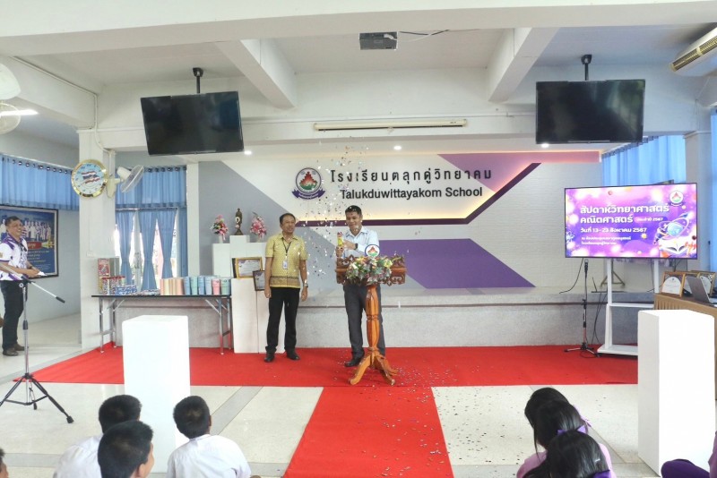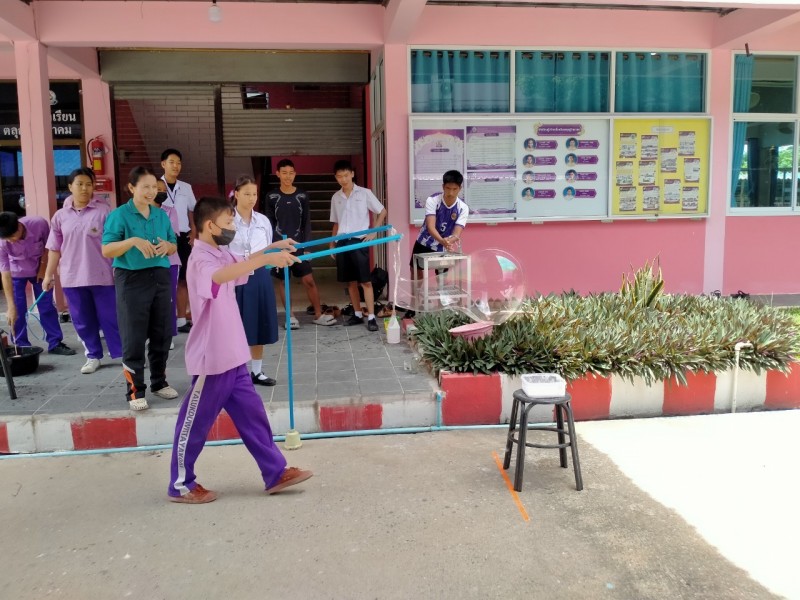 ในการจัดสัปดาห์วิทยาศาสตร์ คณิตศาสตร์ โดยมีนางสาวนภาลัย เชื้อกสิการ หัวหน้ากลุ่มสาระการเรียนรู้วิทยาศาสตร์และเทคโนโลยี กล่าวรายงาน มีการแข่งขันตอบปัญหาวิทยาศาสตร์ - แข่งขันจรวดขวดน้ำ – ประกวดชุดรีไซเคิล - แข่งขันโยนไข่